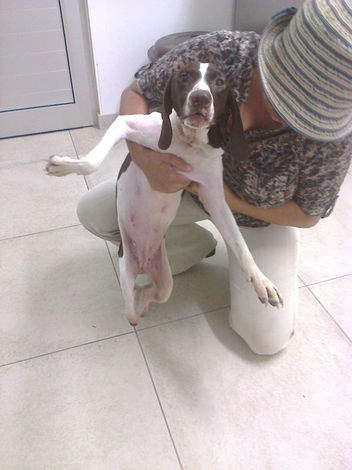 HERMIA, was found in a Larnaca, Republic of Cyprus garbage dumpster on 2 July 2015. Her hind legs had been cut off. Authorities called to the scene put her into a municipal pound, where she would have waited out the statutory 15 days before being put to sleep. Her plight was brought to the attention of Moonacre Sanctuary and Hermia was brought out of the dog pound into foster care on their farm.